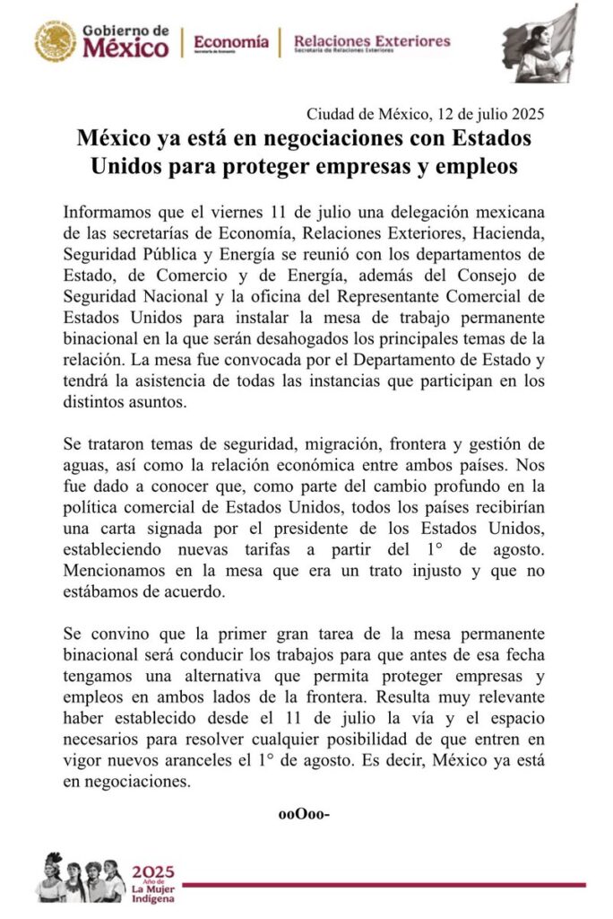 “Resulta muy relevante haber establecido desde el 11 de julio la vía y el espacio necesarios para resolver cualquier posibilidad de que entren en vigor nuevos aranceles el 1° de agosto”, afirmó el gobierno en el texto.